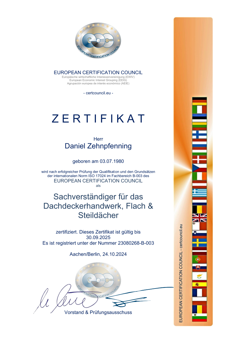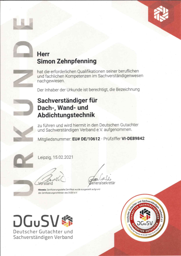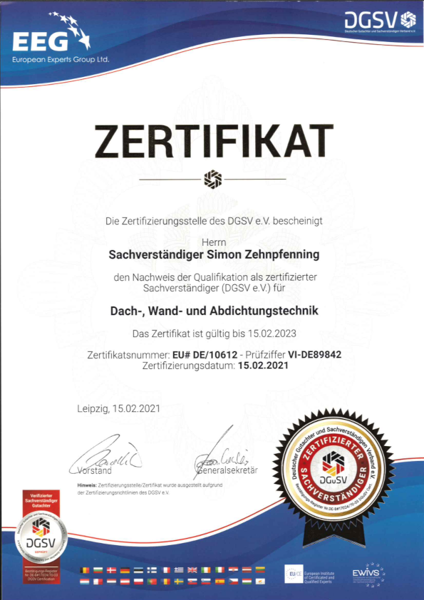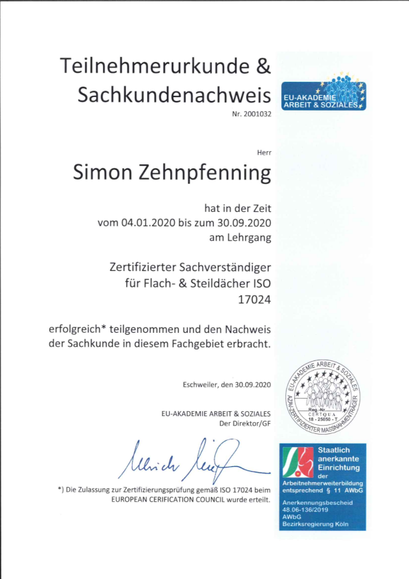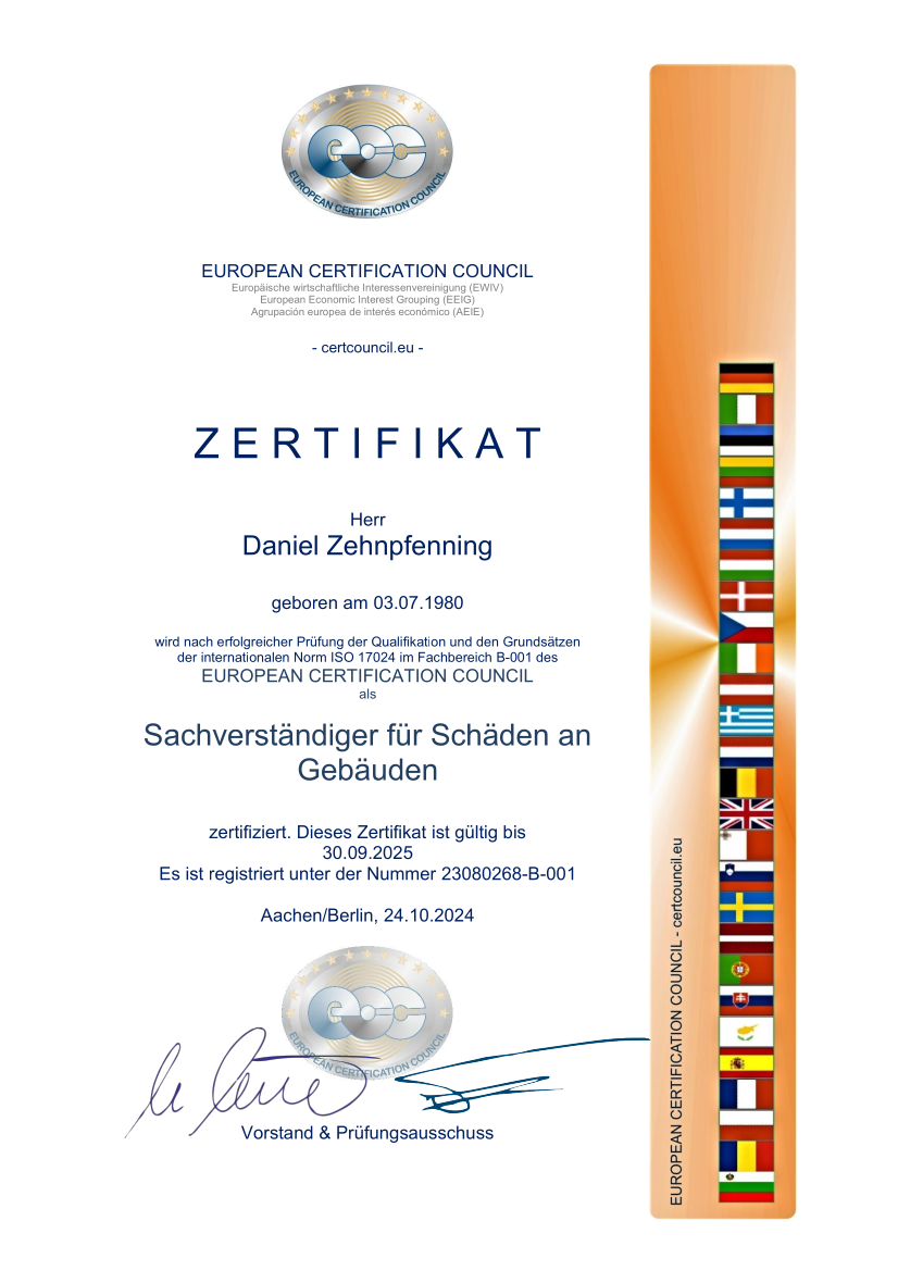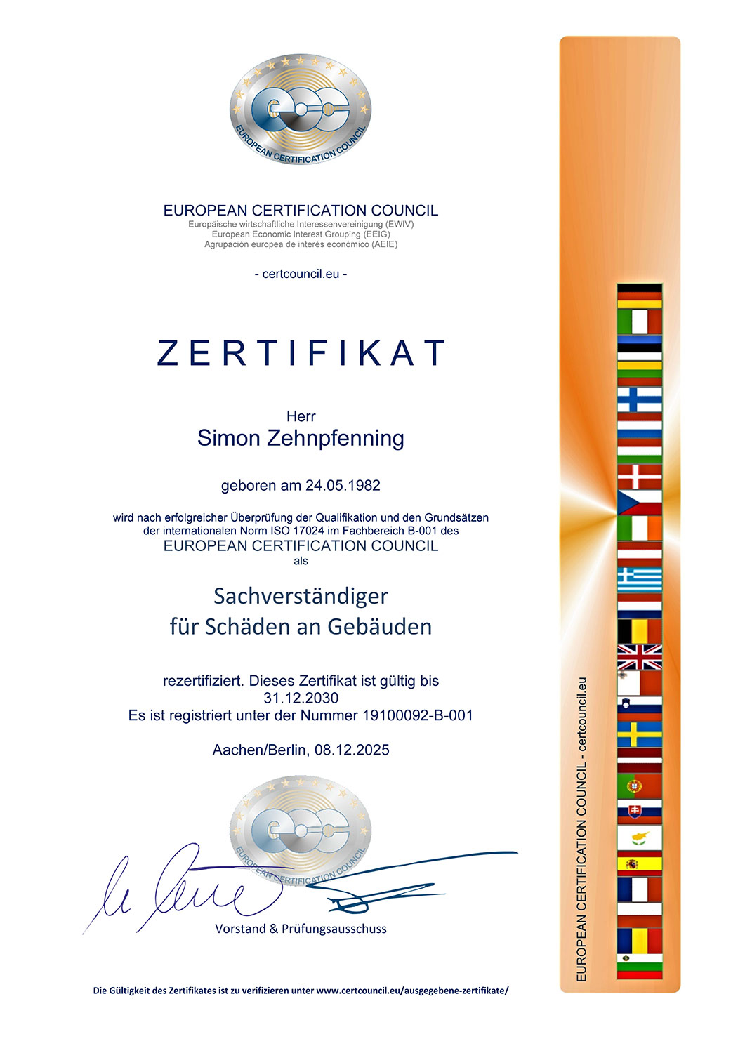 Ich bin zertifizierter Sachverständiger für Brandursachenermittlung durch die Zertifizierungsstelle DGuSV (Zertifikatsnummer DE/10612). Zusätzlich wurde ich gemäß DIN EN ISO/IEC 17024 durch den European Certification Council (B-001 & B-003) als Sachverständiger für Schäden an Gebäuden mit Schwerpunkt auf Dach-, Wand- und Abdichtungstechnik anerkannt. Darüber hinaus bin ich nach DIN EN ISO 9712 als Thermograf zertifiziert. Die ISO 17024-Zertifizierung verpflichtet mich zur regelmäßigen Weiterbildung, Einreichung von Gutachten sowie zur Rezertifizierung in festgelegten Abständen.