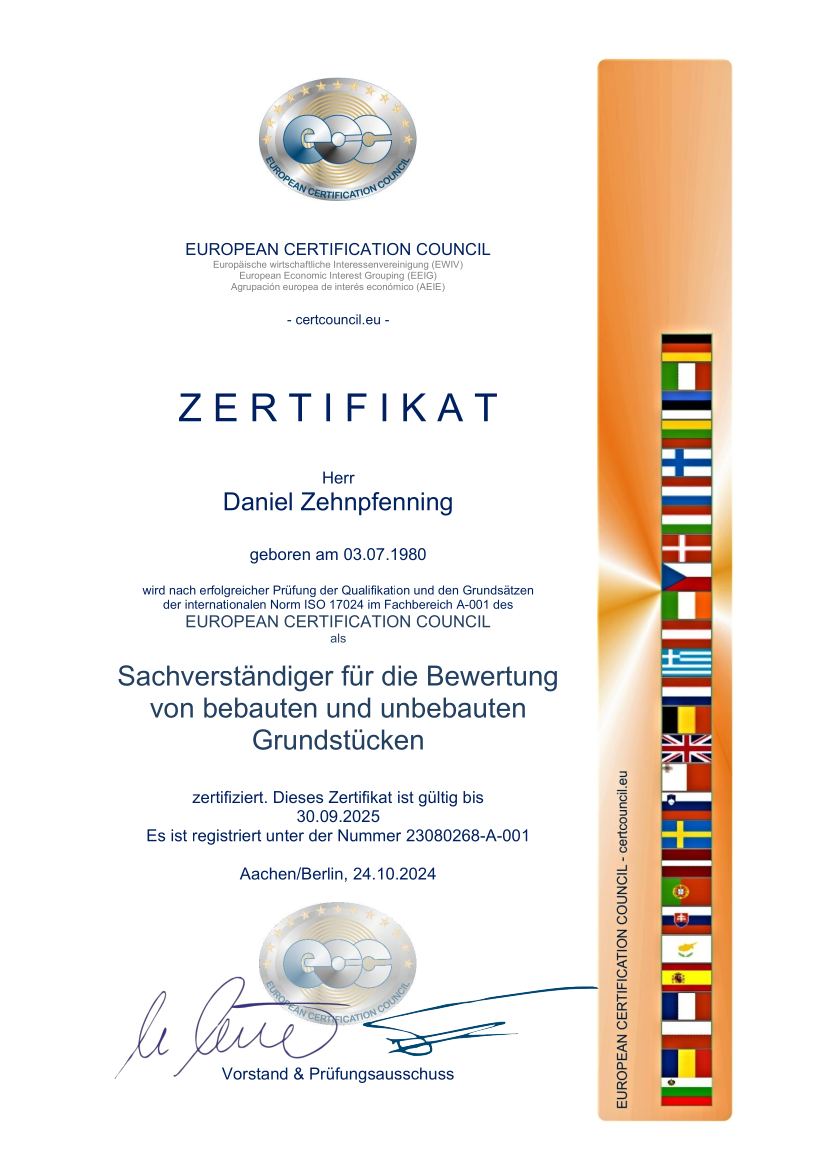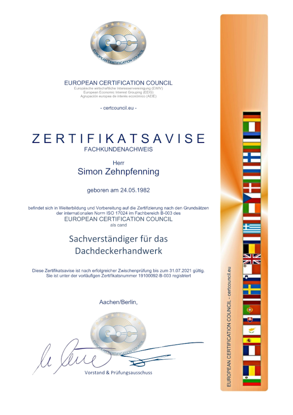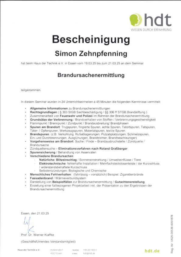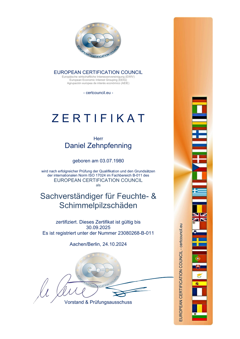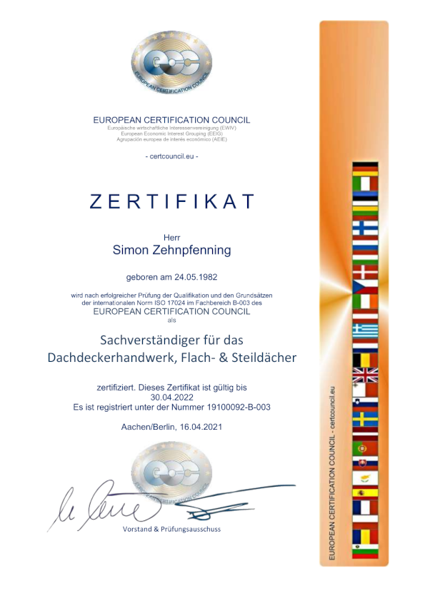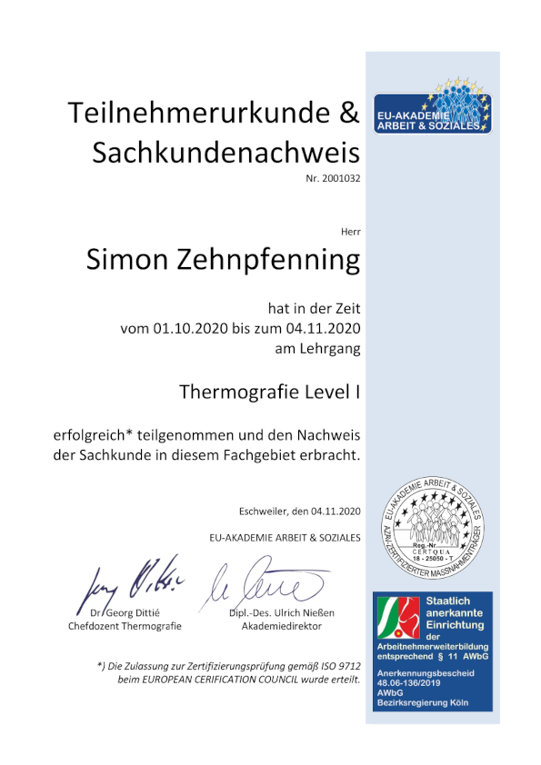 Ich bin zertifizierter Sachverständiger für Brandursachenermittlung durch die Zertifizierungsstelle DGuSV (Zertifikatsnummer DE/10612). Zusätzlich wurde ich gemäß DIN EN ISO/IEC 17024 durch den European Certification Council (B-001 & B-003) als Sachverständiger für Schäden an Gebäuden mit Schwerpunkt auf Dach-, Wand- und Abdichtungstechnik anerkannt. Darüber hinaus bin ich nach DIN EN ISO 9712 als Thermograf zertifiziert. Die ISO 17024-Zertifizierung verpflichtet mich zur regelmäßigen Weiterbildung, Einreichung von Gutachten sowie zur Rezertifizierung in festgelegten Abständen.