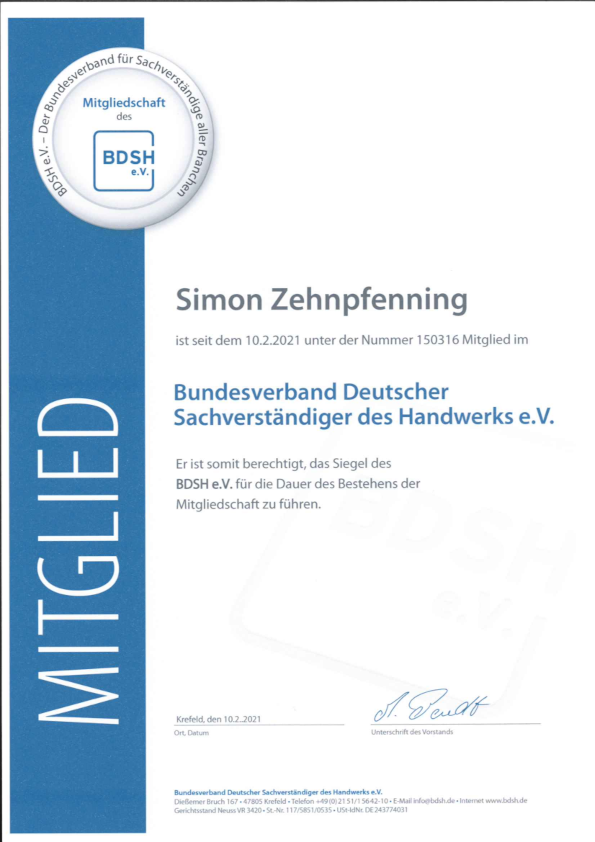 Mein Abschluss als Sachverständiger habe ich im Jahre 2024 / 2025 abgeschlossen. Ich verfüge über mehr als 25 Jahre Berufserfahrung im Baugewerbe, in dem ich im Jahre 2000 meine Gesellenprüfung als Dach,- Wand und Abdichtungstechniker (Dachdecker) abgeschlossen habe. Im Jahre 2006 habe ich erfolgreich meinen Meisterbrief für das Dachdeckerhandwerk herhalten. Dadurch habe ich umfassendes Wissen über Bauzeiten, Abläufe, Materialien, Anfertigungen, Richtlinien und die Organisation von Baustellen erlangt.