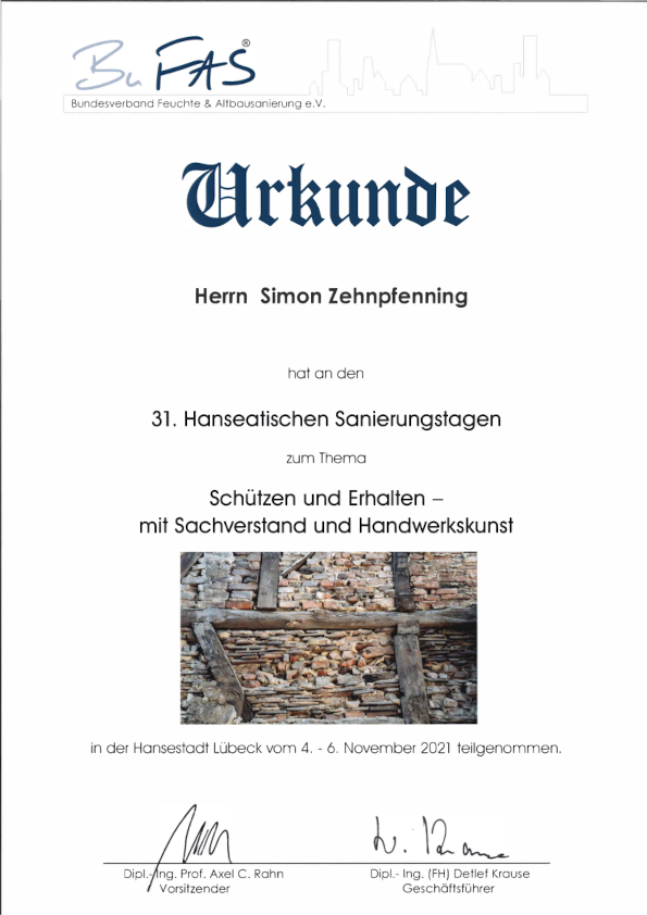 Dank meiner abgeschlossenen Weiterbildung zum zertifizierten Sachverständigen für zum zertifizierten Sachverständigen gemäß DIN EN ISO/IEC 17024 für Schäden an Gebäuden, für Feuchte & Schimmelpilzschäden, Dach-, Wand- und Abdichtungstechnik insbesondere in den Bereichen Bewertung von bebauten und unbebauten Grundstücken. (Zertifizierungsstelle European Certification Council), kann ich Ihnen wertvolle Expertise anbieten. Darüber hinaus bin ich nach DIN EN ISO 9712 als Thermograf zertifiziert (Zertifizierungsstelle European Certification Council).